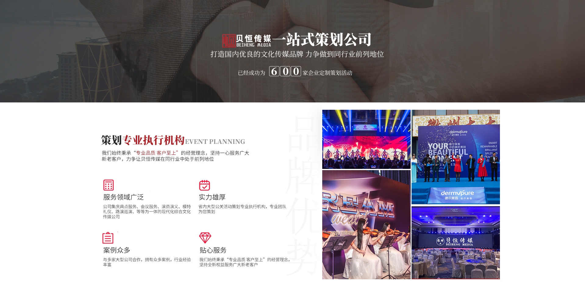 - 合 肥 貝 恒 文 化 傳 媒 專注·專業(yè)·專心·效率 合肥貝恒文化傳媒有限公司2017年成立于安徽·合肥,是省內(nèi)大型公關(guān)活動(dòng)策劃專業(yè)執(zhí)行機(jī)構(gòu),公司集慶典服務(wù)、會(huì)議服務(wù)、演員演藝、模特禮儀、路演巡演、展會(huì)特裝、廣告制作、設(shè)備租賃、舞美策劃、企業(yè)形象宣傳等為一體的現(xiàn)代化綜合文化傳媒公司,我們始終秉承“專業(yè)品質(zhì)客戶至上”的經(jīng)營理念,堅(jiān)持全...